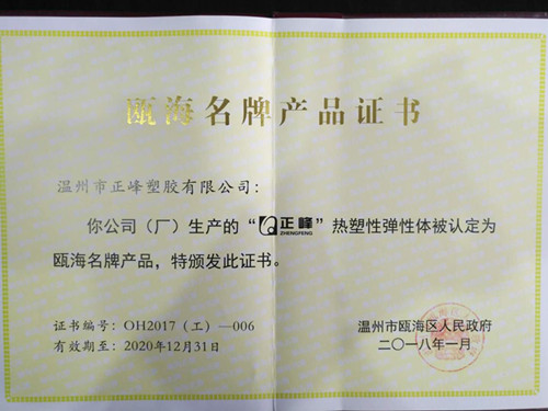 继 2016年被评为“国家高新技术企业”后,正峰塑胶再次传来喜讯,我公司生产的热塑性弹性体被瓯海区人民政府授予“瓯海名牌产品”称号,使我公司品牌建设之路往前迈出了跨越性的一步!